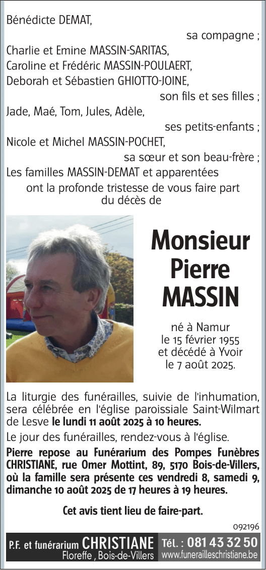 Décédé à Yvoir (5530) le jeudi 7 août 2025 à l'âge de 70 ans