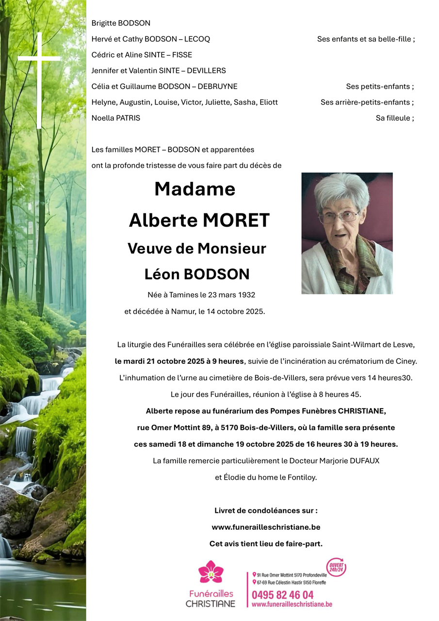 Décédée à Namur (5000) le mardi 14 octobre 2025 à l'âge de 93 ans