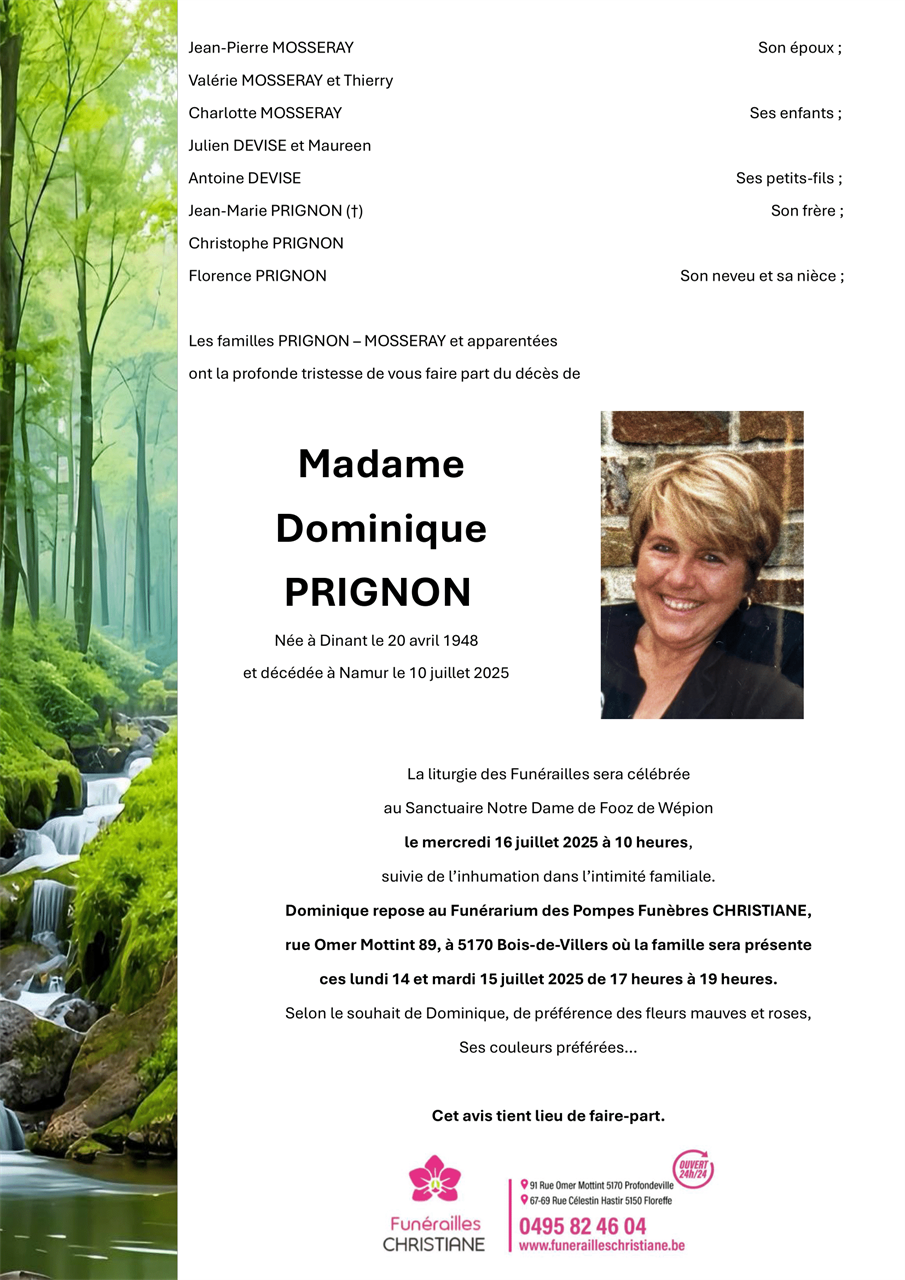 Décédée à Namur (5000) le jeudi 10 juillet 2025 à l'âge de 77 ans