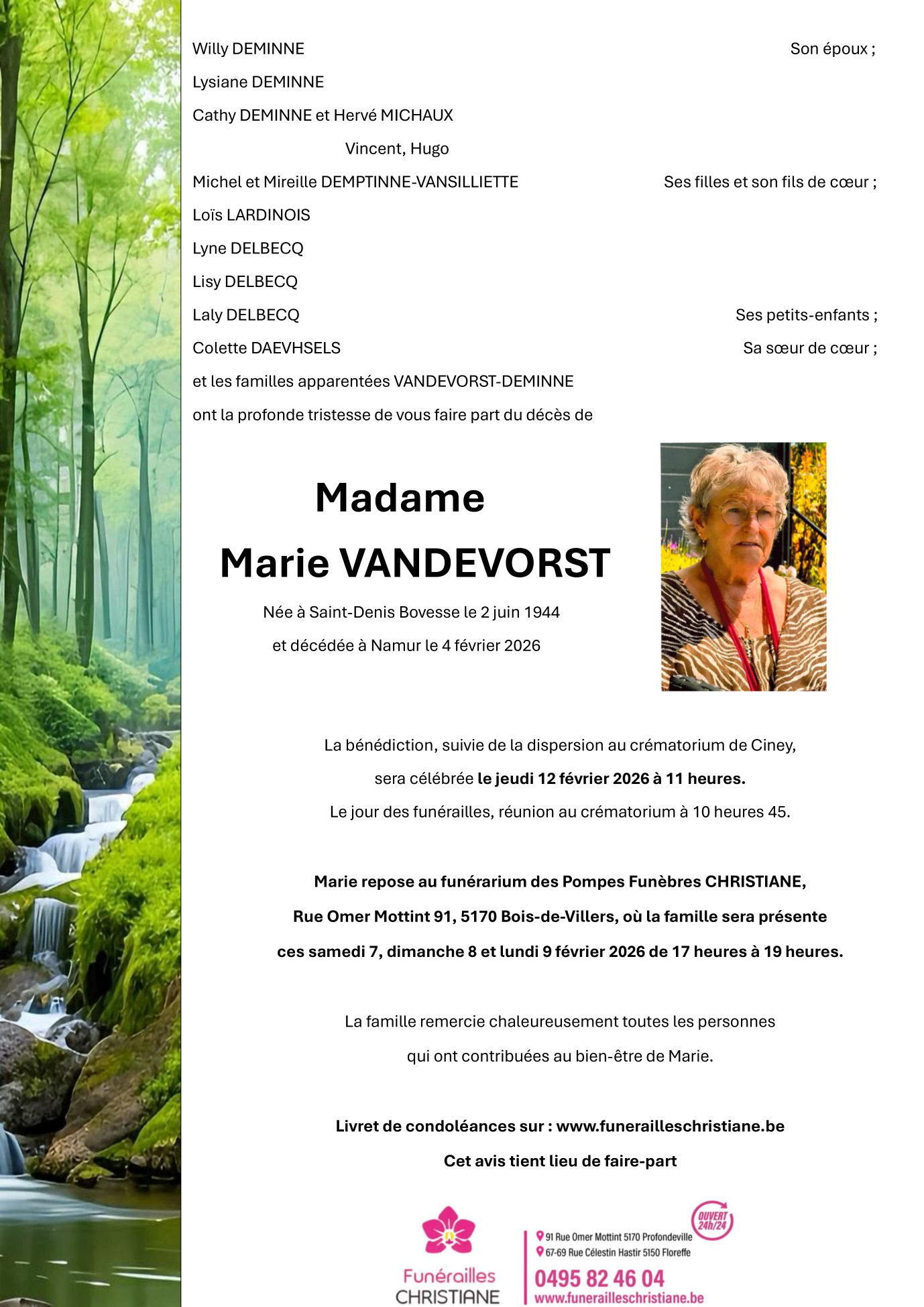 Décédée à Namur (5000) le mercredi 4 février 2026 à l'âge de 81 ans