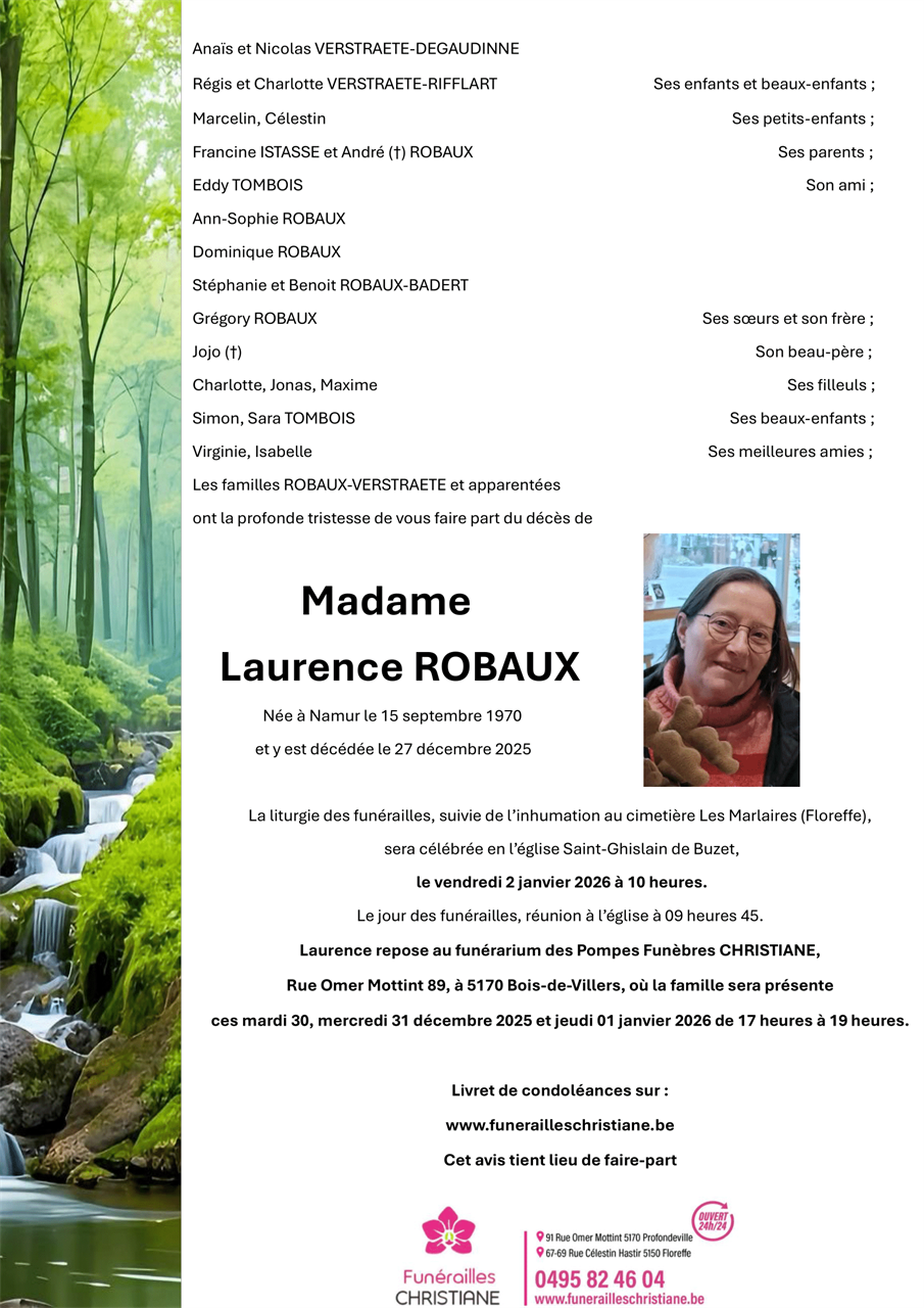 Décédée à Namur (5000) le samedi 27 décembre 2025 à l'âge de 55 ans