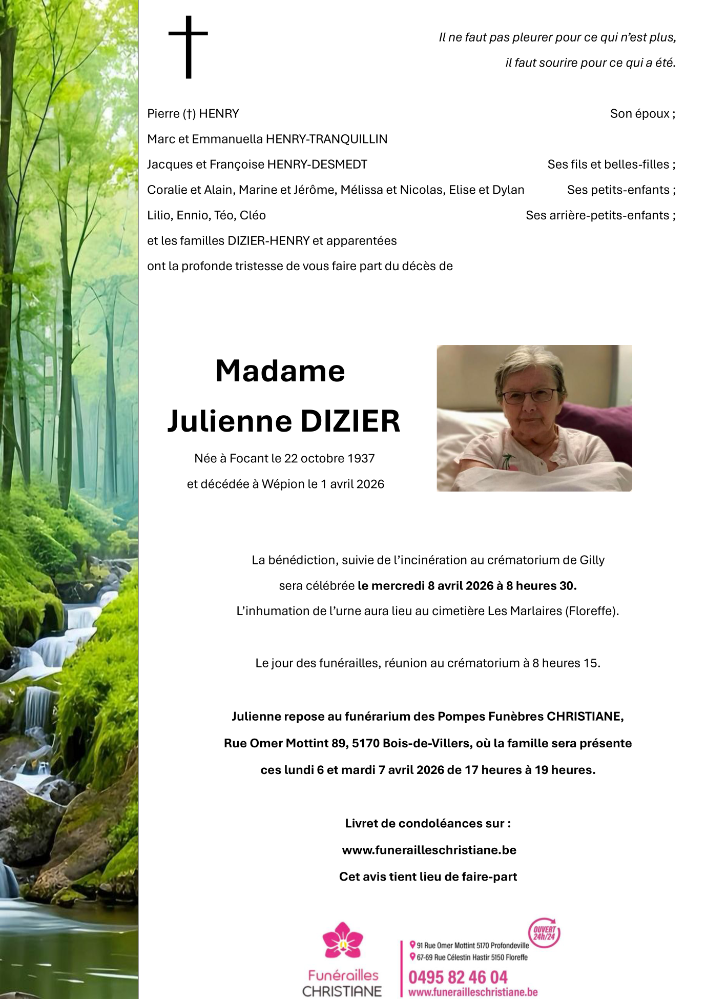 Décédée à Wépion (5100) le mercredi 1 avril 2026 à l'âge de 88 ans